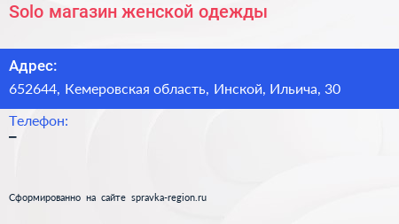 Solo, магазин женской одежды по адресу 652644, Кемеровская область, Инской, Ильича, 30 в дальнейшем Организация, размещена в следующих категориях: