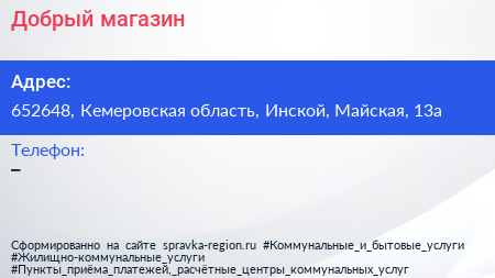 Добрый, магазин по адресу 652648, Кемеровская область, Инской, Майская, 13а в дальнейшем Организация, размещена в следующих категориях: