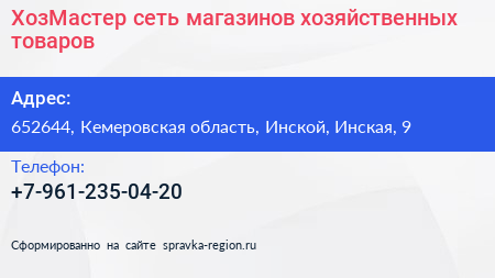 ХозМастер, сеть магазинов хозяйственных товаров по адресу 652644, Кемеровская область, Инской, Инская, 9 в дальнейшем Организация, размещена в следующих категориях: