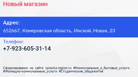 Новый, магазин по адресу 652667, Кемеровская область, Инской, Новая, 23 в дальнейшем Организация, размещена в следующих категориях: