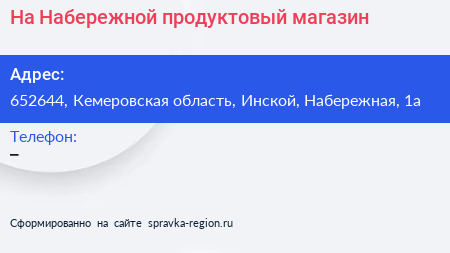 На Набережной, продуктовый магазин по адресу 652644, Кемеровская область, Инской, Набережная, 1а в дальнейшем Организация, размещена в следующих категориях: