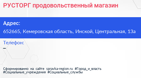 РУСТОРГ, продовольственный магазин по адресу 652665, Кемеровская область, Инской, Центральная, 13а в дальнейшем Организация, размещена в следующих категориях: