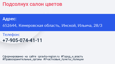 Подсолнух, салон цветов по адресу 652644, Кемеровская область, Инской, Ильича, 28/3 в дальнейшем Организация, размещена в следующих категориях: