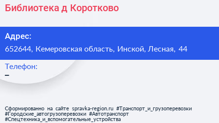Библиотека, д. Коротково по адресу 652644, Кемеровская область, Инской, Лесная, 44 в дальнейшем Организация, размещена в следующих категориях: