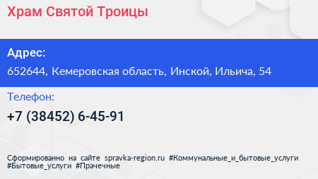 Храм Святой Троицы по адресу 652644, Кемеровская область, Инской, Ильича, 54 в дальнейшем Организация, размещена в следующих категориях: