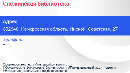 Снежинская библиотека по адресу 652648, Кемеровская область, Инской, Советская, 27 в дальнейшем Организация, размещена в следующих категориях:
