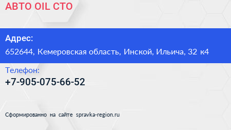 АВТО-OIL, СТО по адресу 652644, Кемеровская область, Инской, Ильича, 32 к4 в дальнейшем Организация, размещена в следующих категориях: