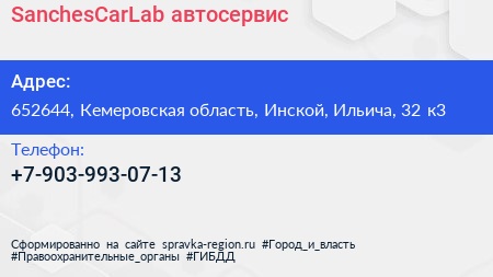 SanchesCarLab, автосервис по адресу 652644, Кемеровская область, Инской, Ильича, 32 к3 в дальнейшем Организация, размещена в следующих категориях: