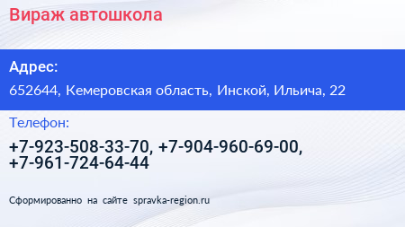 Вираж, автошкола по адресу 652644, Кемеровская область, Инской, Ильича, 22 в дальнейшем Организация, размещена в следующих категориях: