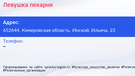 Левушка, пекарня по адресу 652644, Кемеровская область, Инской, Ильича, 23 в дальнейшем Организация, размещена в следующих категориях: