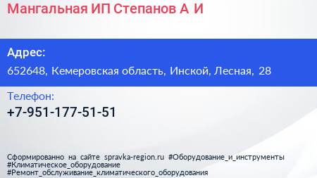 Мангальная, ИП Степанов А.И. по адресу 652648, Кемеровская область, Инской, Лесная, 28 в дальнейшем Организация, размещена в следующих категориях: