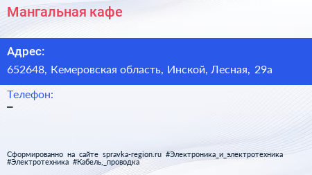 Мангальная, кафе по адресу 652648, Кемеровская область, Инской, Лесная, 29а в дальнейшем Организация, размещена в следующих категориях:
