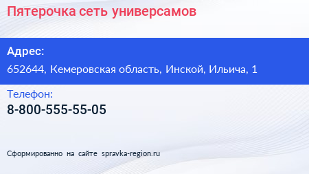Пятерочка, сеть универсамов по адресу 652644, Кемеровская область, Инской, Ильича, 1 в дальнейшем Организация, размещена в следующих категориях: