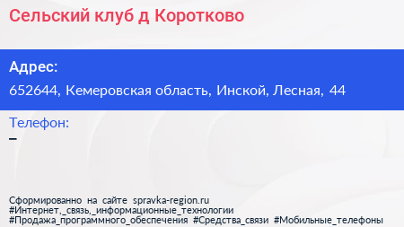 Сельский клуб, д. Коротково по адресу 652644, Кемеровская область, Инской, Лесная, 44 в дальнейшем Организация, размещена в следующих категориях:
