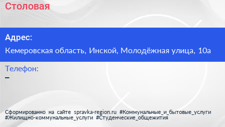 Столовая по адресу Кемеровская область, Инской, Молодёжная улица, 10а в дальнейшем Организация, размещена в следующих категориях: