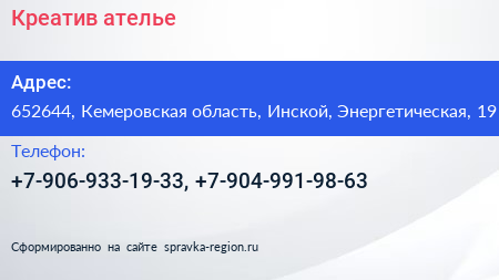Креатив, ателье по адресу 652644, Кемеровская область, Инской, Энергетическая, 19 в дальнейшем Организация, размещена в следующих категориях: