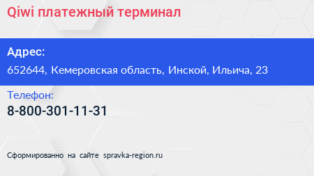 Qiwi, платежный терминал по адресу 652644, Кемеровская область, Инской, Ильича, 23 в дальнейшем Организация, размещена в следующих категориях: