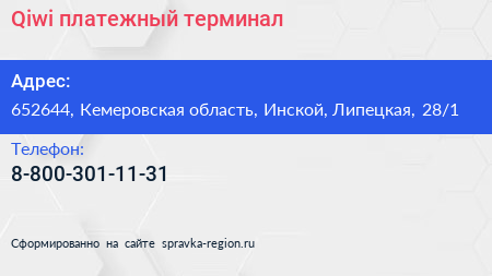 Qiwi, платежный терминал по адресу 652644, Кемеровская область, Инской, Липецкая, 28/1 в дальнейшем Организация, размещена в следующих категориях: