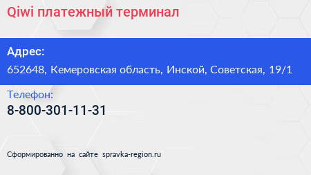 Qiwi, платежный терминал по адресу 652648, Кемеровская область, Инской, Советская, 19/1 в дальнейшем Организация, размещена в следующих категориях: