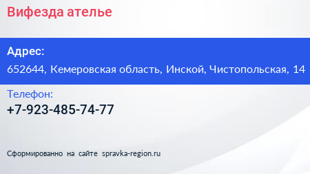 Вифезда, ателье по адресу 652644, Кемеровская область, Инской, Чистопольская, 14 в дальнейшем Организация, размещена в следующих категориях: