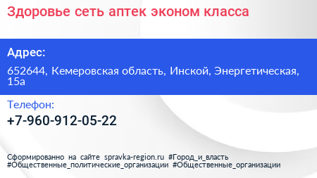 Здоровье, сеть аптек эконом-класса по адресу 652644, Кемеровская область, Инской, Энергетическая, 15а в дальнейшем Организация, размещена в следующих категориях: