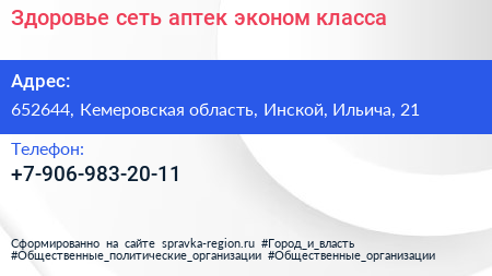 Здоровье, сеть аптек эконом-класса по адресу 652644, Кемеровская область, Инской, Ильича, 21 в дальнейшем Организация, размещена в следующих категориях: