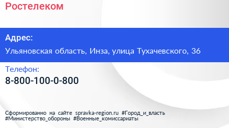 Ростелеком по адресу Ульяновская область, Инза, улица Тухачевского, 36 в дальнейшем Организация, размещена в следующих категориях:
