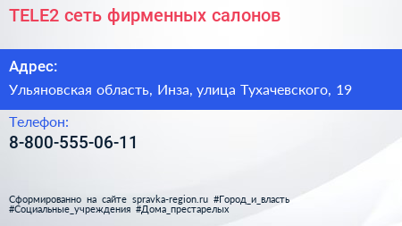TELE2, сеть фирменных салонов по адресу Ульяновская область, Инза, улица Тухачевского, 19 в дальнейшем Организация, размещена в следующих категориях: