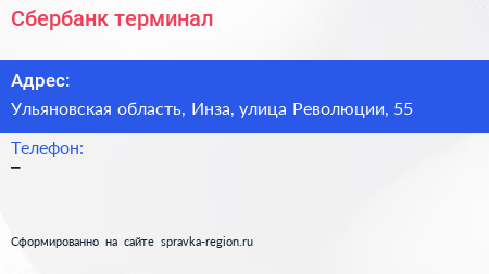 Сбербанк, терминал по адресу Ульяновская область, Инза, улица Революции, 55 в дальнейшем Организация, размещена в следующих категориях: