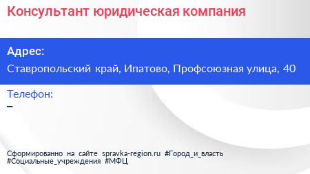 Консультант, юридическая компания по адресу Ставропольский край, Ипатово, Профсоюзная улица, 40 в дальнейшем Организация, размещена в следующих категориях: