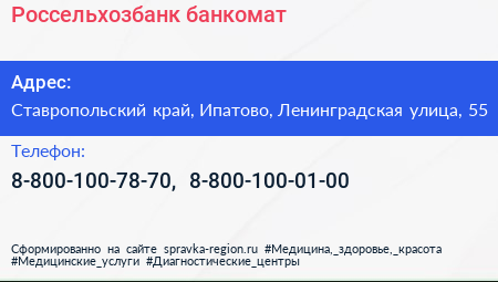 Россельхозбанк, банкомат по адресу Ставропольский край, Ипатово, Ленинградская улица, 55 в дальнейшем Организация, размещена в следующих категориях: