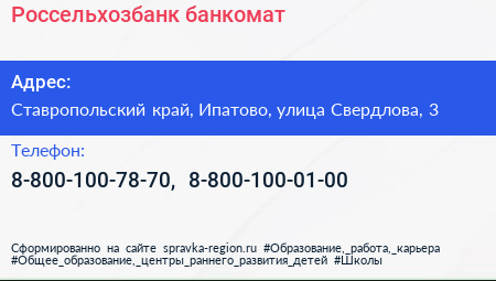 Россельхозбанк, банкомат по адресу Ставропольский край, Ипатово, улица Свердлова, 3 в дальнейшем Организация, размещена в следующих категориях: