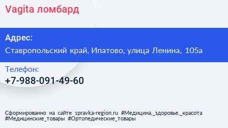 Vagita, ломбард по адресу Ставропольский край, Ипатово, улица Ленина, 105а в дальнейшем Организация, размещена в следующих категориях:
