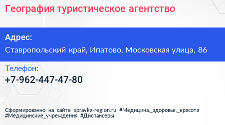 География, туристическое агентство по адресу Ставропольский край, Ипатово, Московская улица, 86 в дальнейшем Организация, размещена в следующих категориях: