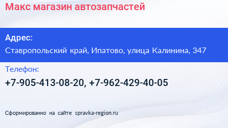 Макс, магазин автозапчастей по адресу Ставропольский край, Ипатово, улица Калинина, 347 в дальнейшем Организация, размещена в следующих категориях:
