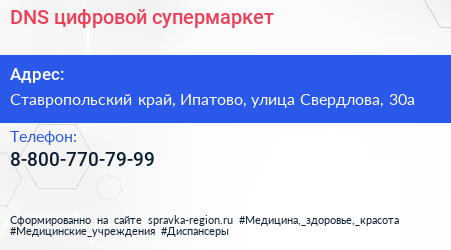 DNS, цифровой супермаркет по адресу Ставропольский край, Ипатово, улица Свердлова, 30а в дальнейшем Организация, размещена в следующих категориях: