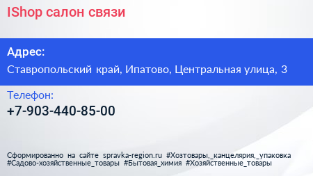 IShop, салон связи по адресу Ставропольский край, Ипатово, Центральная улица, 3 в дальнейшем Организация, размещена в следующих категориях: