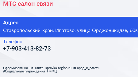 МТС, салон связи по адресу Ставропольский край, Ипатово, улица Орджоникидзе, 60в в дальнейшем Организация, размещена в следующих категориях: