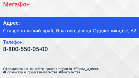 МегаФон по адресу Ставропольский край, Ипатово, улица Орджоникидзе, 62 в дальнейшем Организация, размещена в следующих категориях: