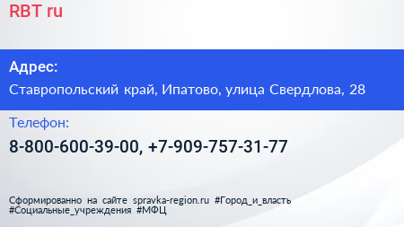 RBT.ru по адресу Ставропольский край, Ипатово, улица Свердлова, 28 в дальнейшем Организация, размещена в следующих категориях: