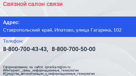 Связной, салон связи по адресу Ставропольский край, Ипатово, улица Гагарина, 102 в дальнейшем Организация, размещена в следующих категориях: