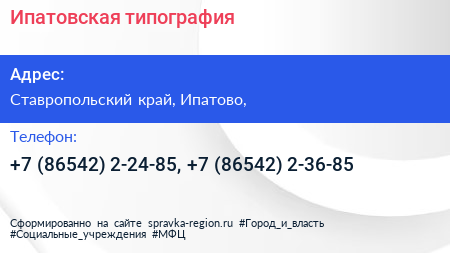 Ипатовская типография по адресу Ставропольский край, Ипатово, в дальнейшем Организация, размещена в следующих категориях: