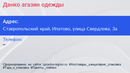 Данко, агазин одежды по адресу Ставропольский край, Ипатово, улица Свердлова, 3а в дальнейшем Организация, размещена в следующих категориях: