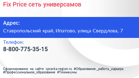 Fix Price, сеть универсамов по адресу Ставропольский край, Ипатово, улица Свердлова, 7 в дальнейшем Организация, размещена в следующих категориях:
