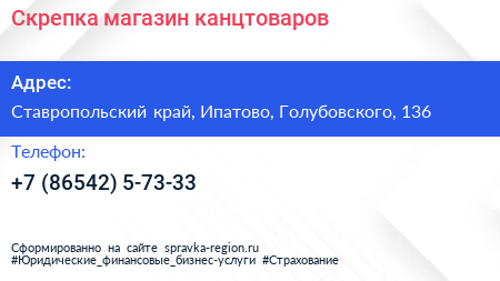 Скрепка, магазин канцтоваров по адресу Ставропольский край, Ипатово, Голубовского, 136 в дальнейшем Организация, размещена в следующих категориях: