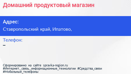 Домашний, продуктовый магазин по адресу Ставропольский край, Ипатово, в дальнейшем Организация, размещена в следующих категориях: