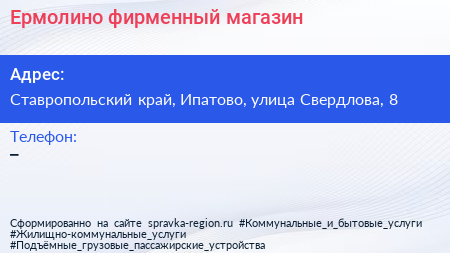 Ермолино, фирменный магазин по адресу Ставропольский край, Ипатово, улица Свердлова, 8 в дальнейшем Организация, размещена в следующих категориях: