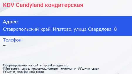 KDV Candyland, кондитерская по адресу Ставропольский край, Ипатово, улица Свердлова, 8 в дальнейшем Организация, размещена в следующих категориях: