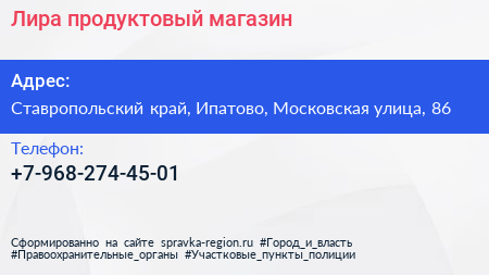Лира, продуктовый магазин по адресу Ставропольский край, Ипатово, Московская улица, 86 в дальнейшем Организация, размещена в следующих категориях: