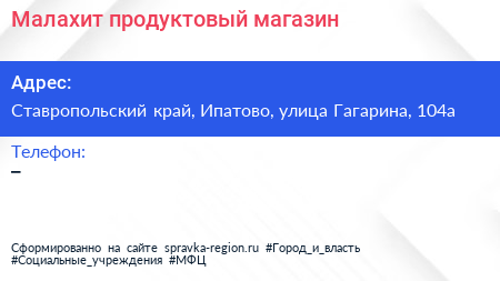 Малахит, продуктовый магазин по адресу Ставропольский край, Ипатово, улица Гагарина, 104а в дальнейшем Организация, размещена в следующих категориях: